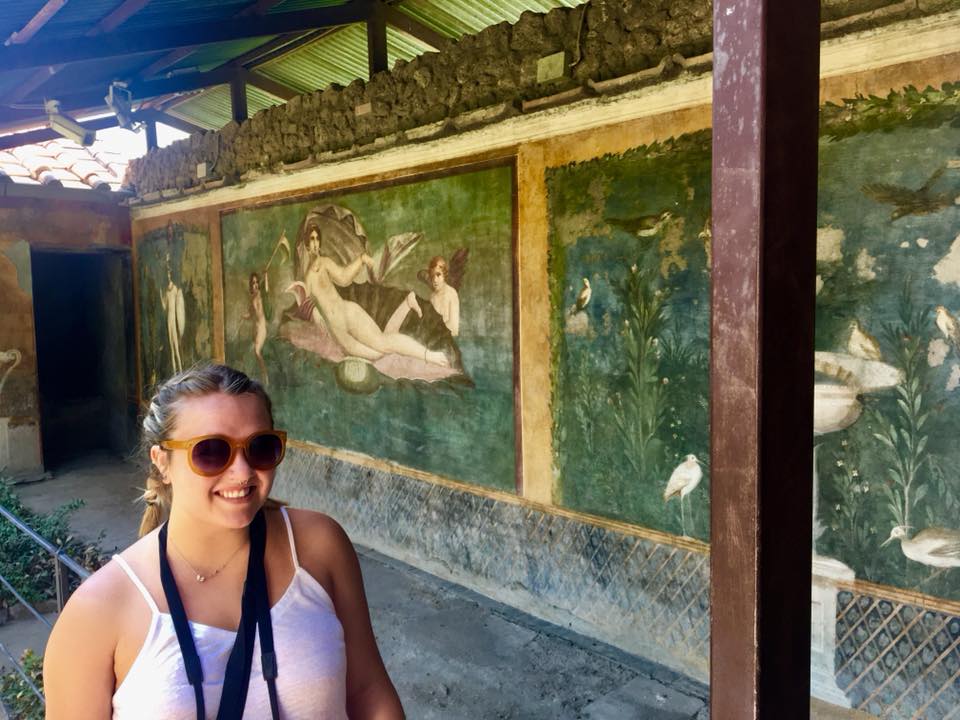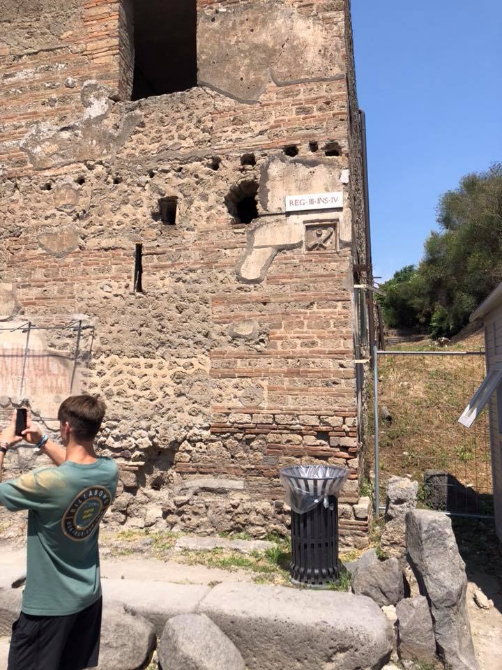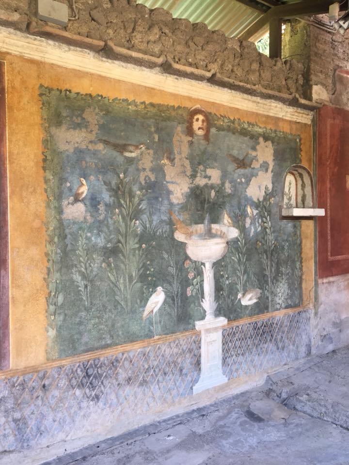 This once bustling commercial center with a population of 10,000 to 20,000 covers 160 acres. Approximately one third of the ruins have been unearthed. Our family walked along the tracks of chariot wheels cut in the pavement. The rings where the horses were tied still remain near the sisterns which allowed them to drink the fresh mountain water while their charioteers enjoyed a beer. Pompeii’s frescoes which are painted in vibrant reds and orange have remarkably retained their vibrancy. You could feel the presence of the people as we wandered past what once obviously was their home.